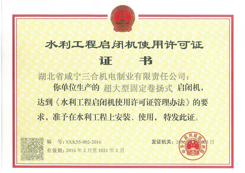 超大型固定卷?yè)P式啟閉機產(chǎn)品使用許可證