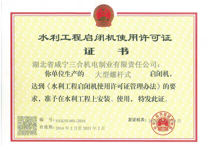 大型螺桿式啟閉機產(chǎn)品使用許可證
