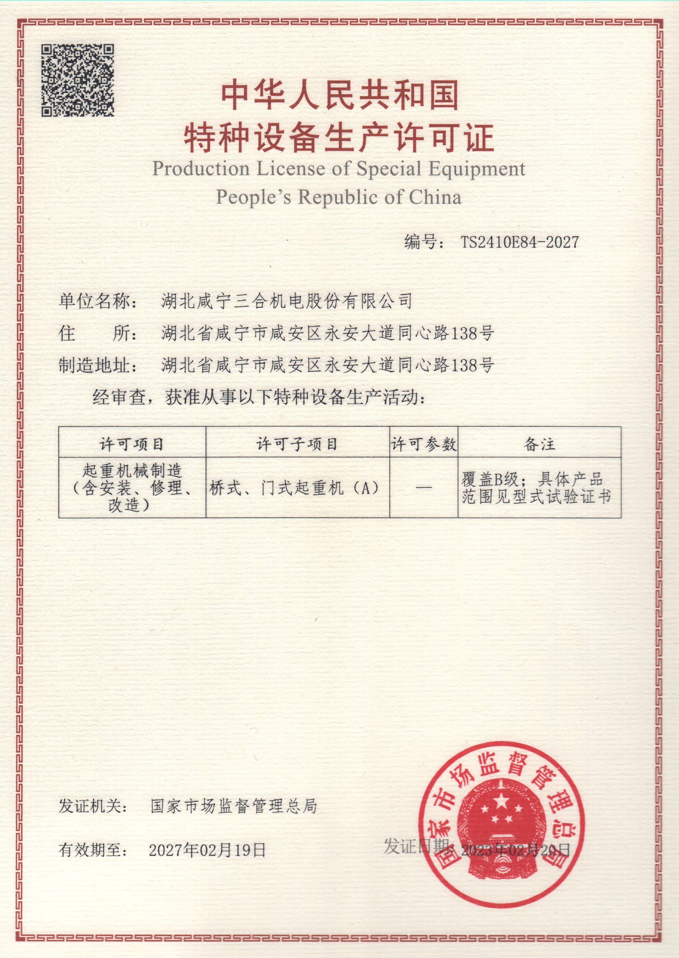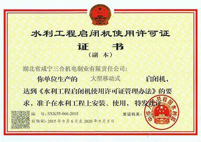 大型移動(dòng)式啟閉機產(chǎn)品使用許可證