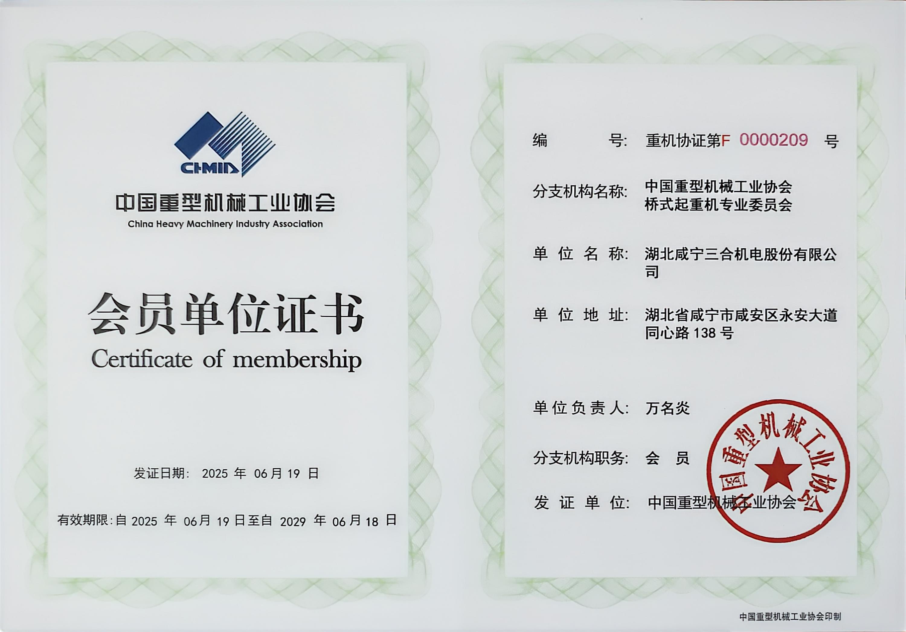 中國重型機械工業(yè)協(xié)會(huì )橋式起重機專(zhuān)業(yè)委員會(huì )會(huì )員單位證書(shū)
