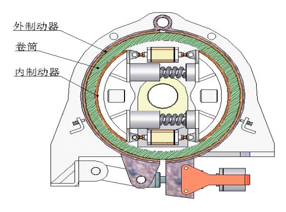 2、起重設備的低速制動(dòng)器為安全制動(dòng)器,通常直接制動(dòng)卷筒,是一種防止高速制動(dòng)失效和傳動(dòng)鏈中間部件損壞的低速安全制動(dòng)裝置 。目前國內外起重設備的低速安全制動(dòng)普遍采用的是盤(pán)式制動(dòng)器。而盤(pán)式制動(dòng)器的結構復雜,體積龐大,制造成本昂貴,制動(dòng)性能難以達到預期的效果。針對這種高成本、低效益的產(chǎn)品我們研制開(kāi)發(fā)出了一種ZLYZ型卷筒內外雙制動(dòng)裝置新型專(zhuān)利產(chǎn)品,這種制動(dòng)裝置同時(shí)直接制動(dòng)卷筒末端的內外圓面,具有雙重制動(dòng)的效果,大大減小了制動(dòng)器的結構體積,提高了制動(dòng)器的制動(dòng)性能。